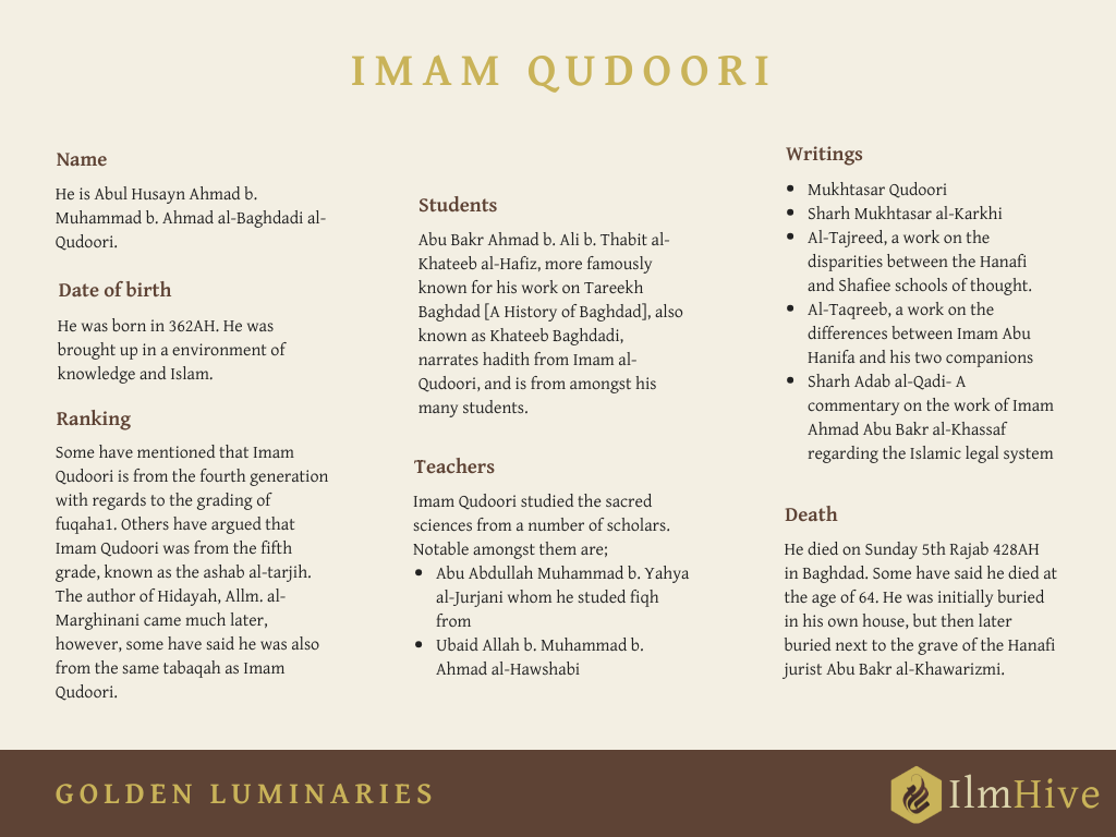 Some have mentioned that Imam Qudoori is from the fourth generation with regards to the grading of fuqaha1. Others have argued that Imam Qudoori was from the fifth grade, known as the ashab al-tarjih. The author of Hidayah, Allm. al-Marghinani came much later, however, some have said he was also from the same tabaqah as Imam Qudoori.