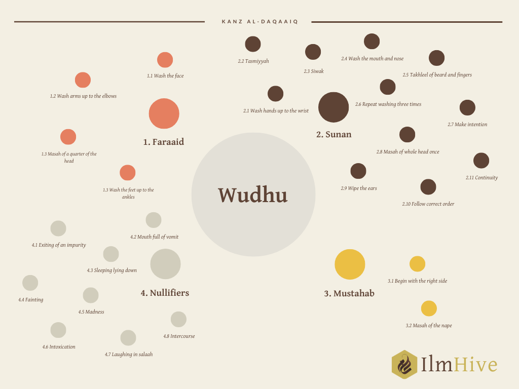 Therefore the faraaidh (obligatory actions) of wudhu are four; (1) to wash the face, (2) to wash the arms up to the elbows, (3) to do masah of the head and (4) to wash the feet up to the ankles.