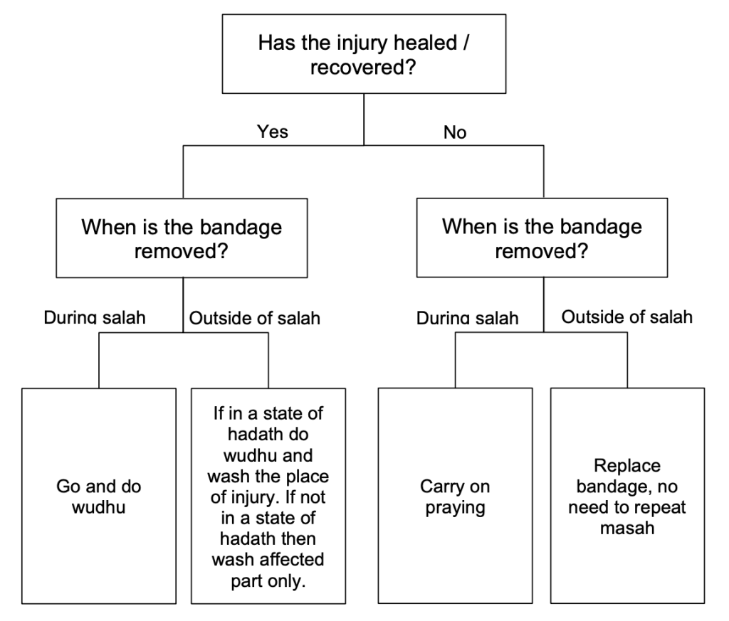 When the bandage is removed after having done masah upon it, it will either be removed after the injury has healed, or not. In both of these cases, the bandage will be removed either in salah or outside of salah. In each of the four cases mentioned above, there is a different ruling.