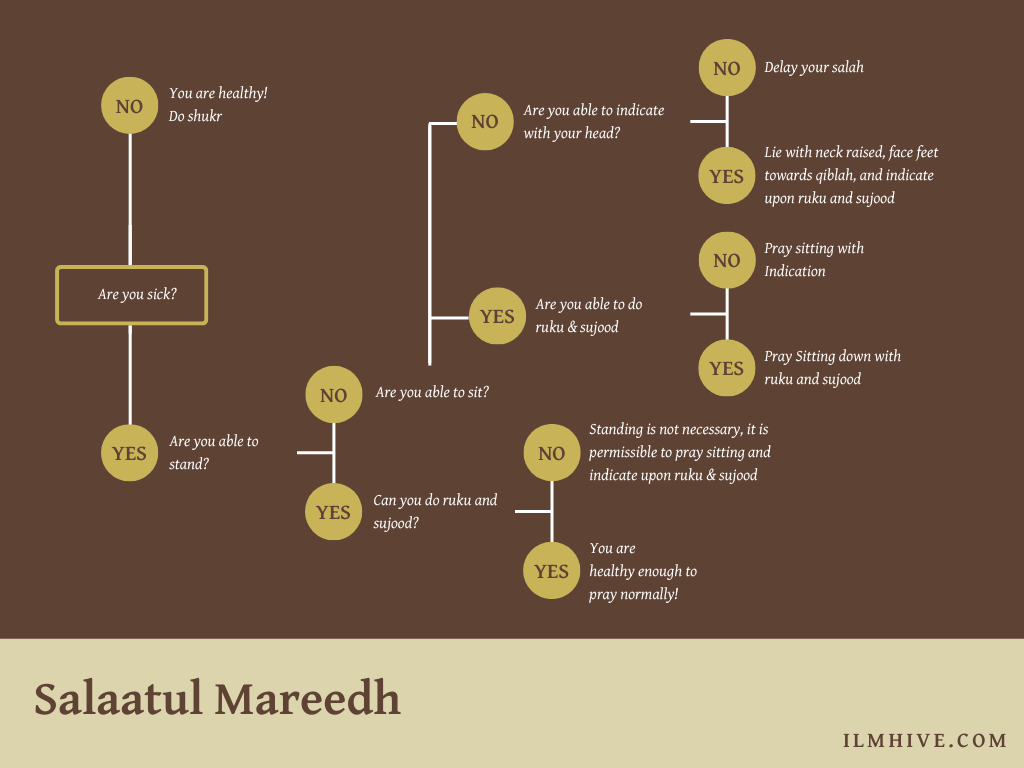 - When a sick person is unable to stand, they should pray sitting with ruku and sujood.