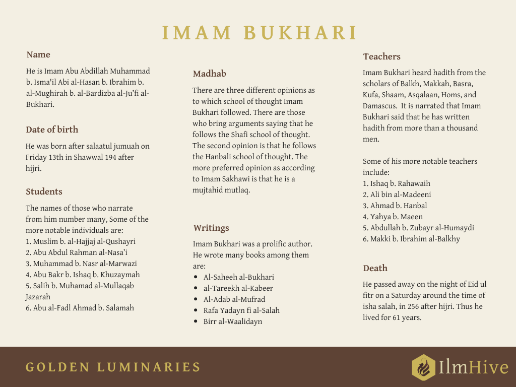 He is Imam Abu Abdillah Muhammad ibn Isma’il Abi al-Hasan ibn Ibrahim ibn al-Mughirah ibn al-Bardizba al-Ju’fi al-Bukhari. The father of Imam Bukhari, Isma’il Abi al-Hasan, was a pious scholar of his time. He passed away when Imam Bukhari was still a small child. Thus he was raised as an orphan at the hands of his mother and older brother. The great grandfather of Imam Bukhari, Al-Mughirah ibn al-Bardizba became a muslim at the hands of Yamaan al-Ju’fi, the guardian of Bukhara. Therefore he is called al-Ju’fi as it was the practise of that time, that who ever becomes a muslim at the hands of another, he attributes his name to that individual. He is called al-Bukhari as he was born in Bukhara. He was born after salatul jumuah on Friday 13th in Shawwal 194 after hijri.